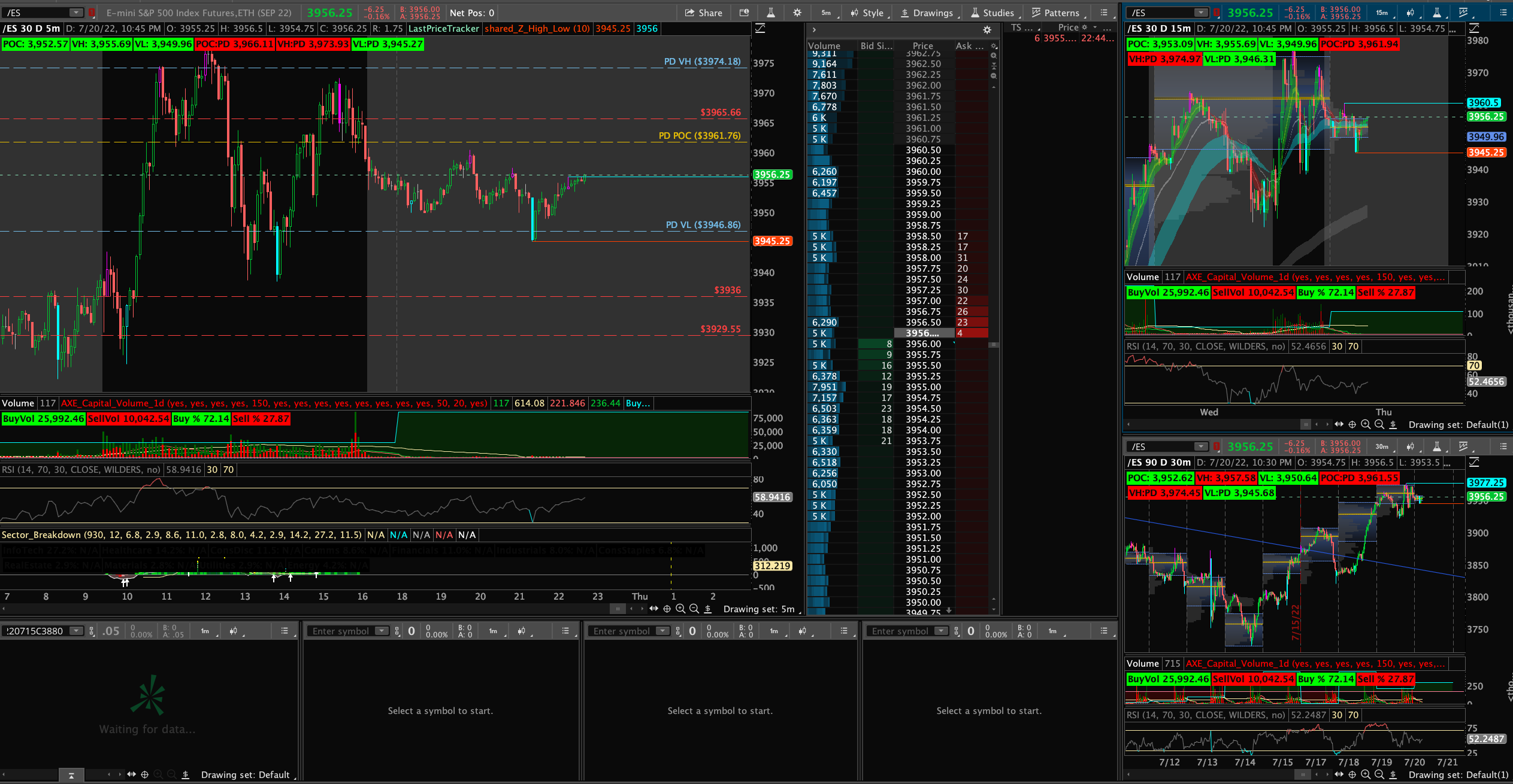 Intraday layout - 5min chart for while I am watching the Depth of Market and also have a 15min and 30min chart to watch as well. At the bottom you can put your Contacts you are watching for options! Just right click on any contract under “trade tab” and paste it where you would type the symbol.