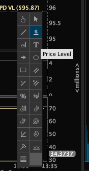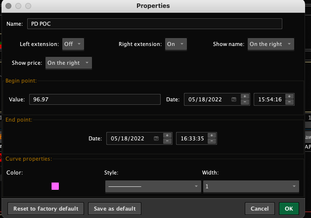 You can click the drawing tool and click price level and plot out the level. Then RIGHT CLICK and change the settings to the second picture and type in a name. RIGHT EXTENSION “ON”, SHOW NAME “On The Right” and SHOW PRICE LEVEL"On The Right”. You can even create a drawing set and call it 5m “for the 5min chart you have your levels plotted for the 5min or 1min intra day time frame and then on the 30min chart the plot levels are not in the way of the Volume Profile as you can see in my example below I have a drawing set called “blank”.