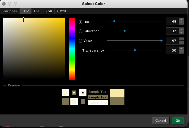 Click “MORE” from here select “HSV” at the top and then change it to whatever color you and then the transparency to 50% or higher.