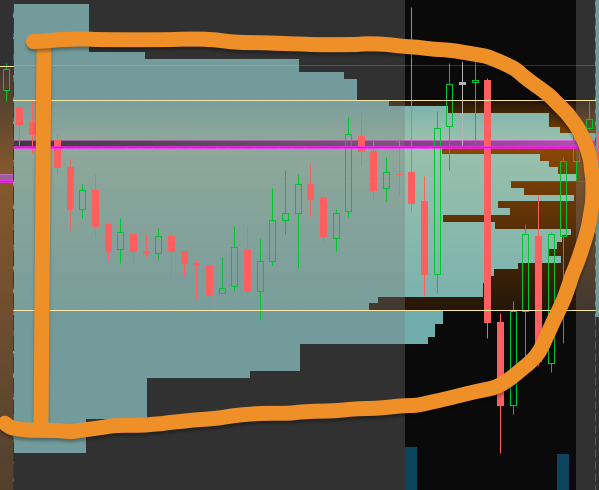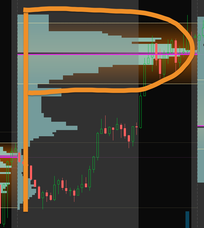 Every time a contract is traded the volume profile builds out to the right as more and more contracts are traded at that price.