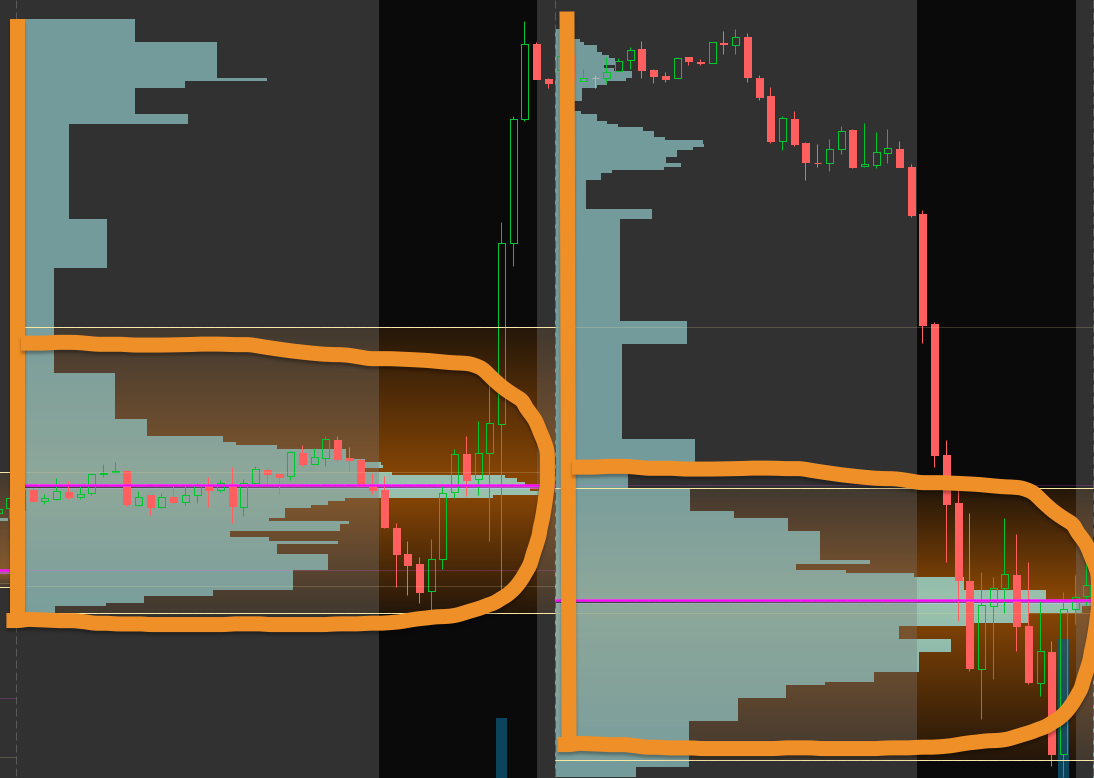 On the RIGHT the next day since price rejected it came right down and did not agree price was “fair” at the previous day point of control “POC” It went slightly lower and build a value area half of yesterdays profile from the previous day POC which became the value area high “VH” of the second day and then the new low was below the previous day value area low “VL”
