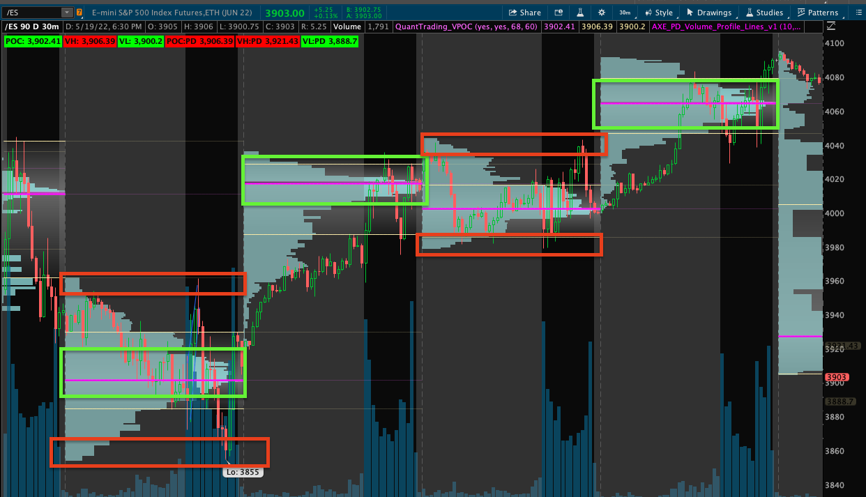 CUSTOM LABELS: Labels at the top chart show the POC VL VH for the day and then the PREVIOUS Day Values. RED if price is below the value and GREEN if price is above the value.