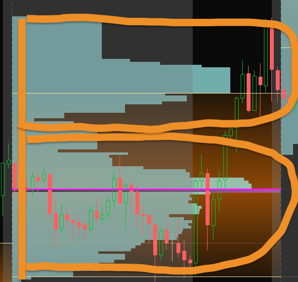 With volume profile instead of it being on the X axis “bottom” of the chart it is on the Y axis “left" side horizontally. In the picture below it is the BLUE Sideways bars.
