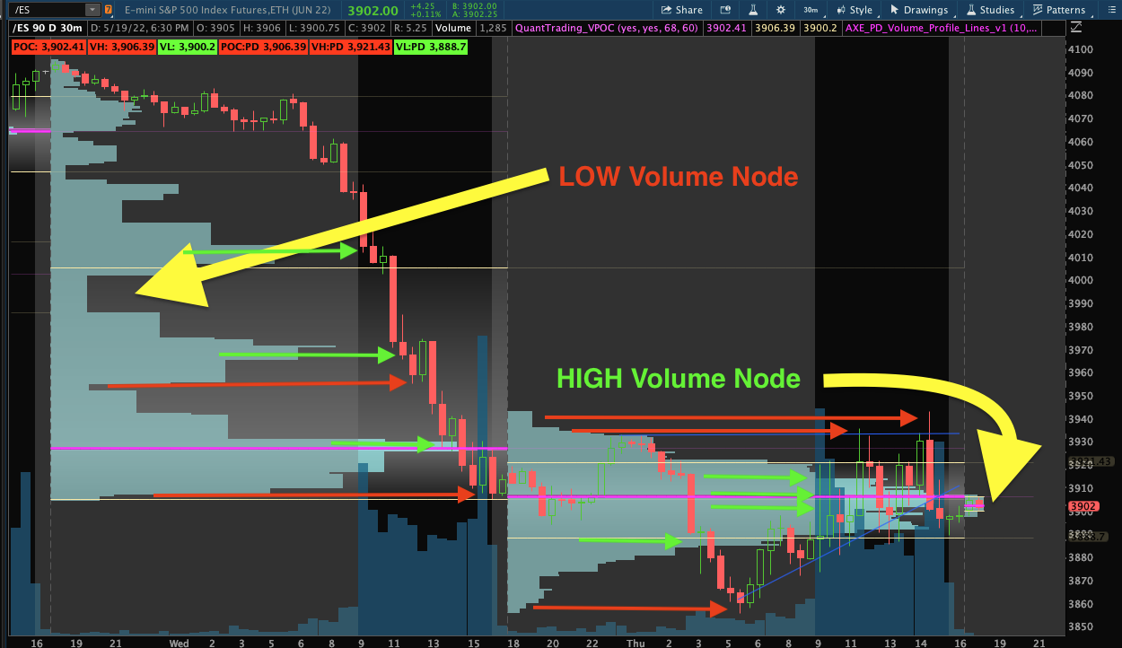 LOW Volume Nodes: (RED ARROWS —> in picture below) Are were a LOW number of contracts are traded so it is fast for price to move through these nodes usually.