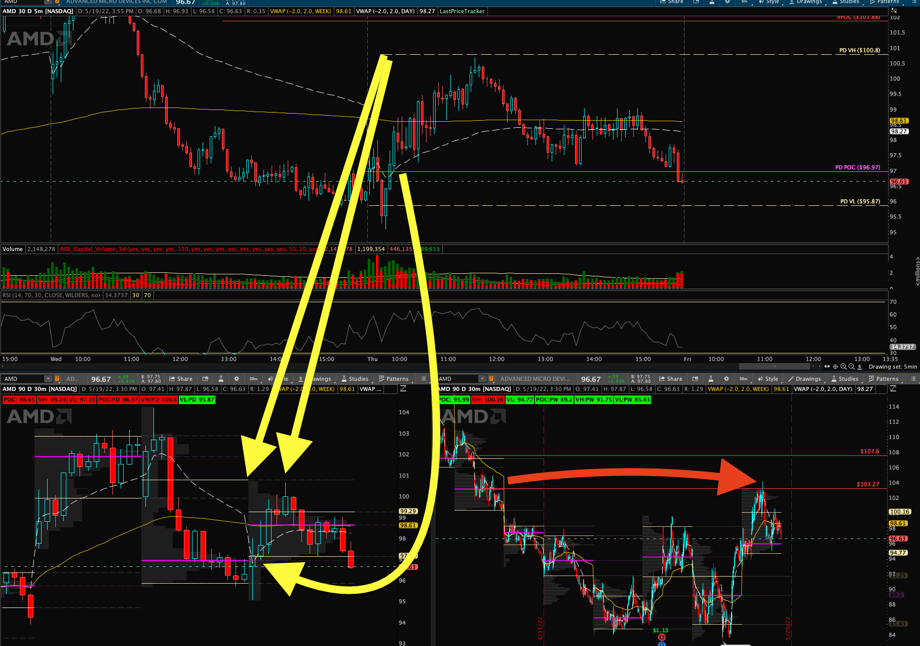 - OPEN BELOW PD POC: If we open below the PD POC I look to play the downside as if we bounce the first level of resistance will be the PD POC. If we get through POC I look for a retest of POC or strength and momentum then play the “OPEN ABOVE POC" levels. If we reject PD POC, I look for the break to the downside and see if we slide down to previous day value area low “PD VL”. If that does not offer support I look at the next levels of days in that range of VH, POC and VL levels that may offer support. Sometimes I look at weekly chart to get a big picture perspective as if we are above the weekly POC or BELOW.